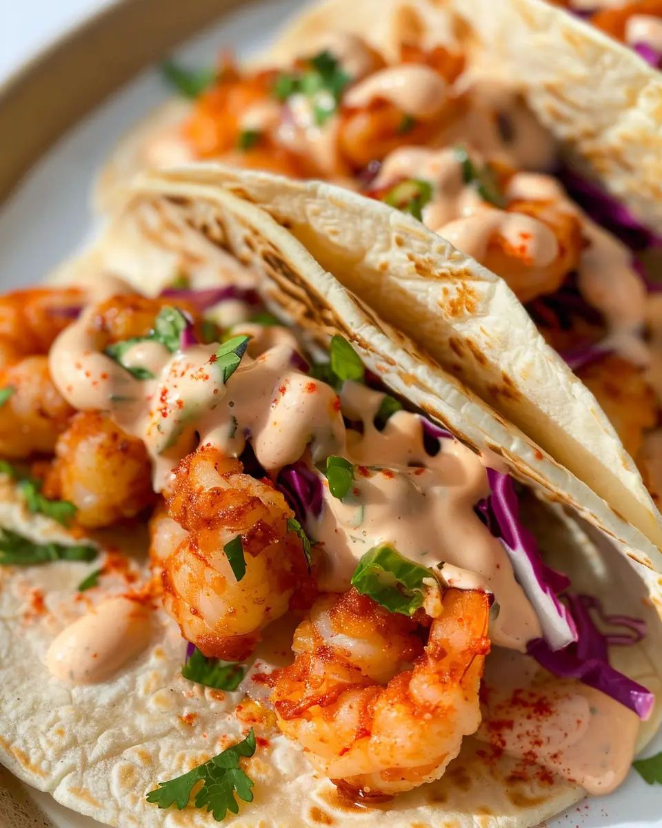 - Assemble the tacos by placing shrimp on tortillas, topping with cabbage and sauce.