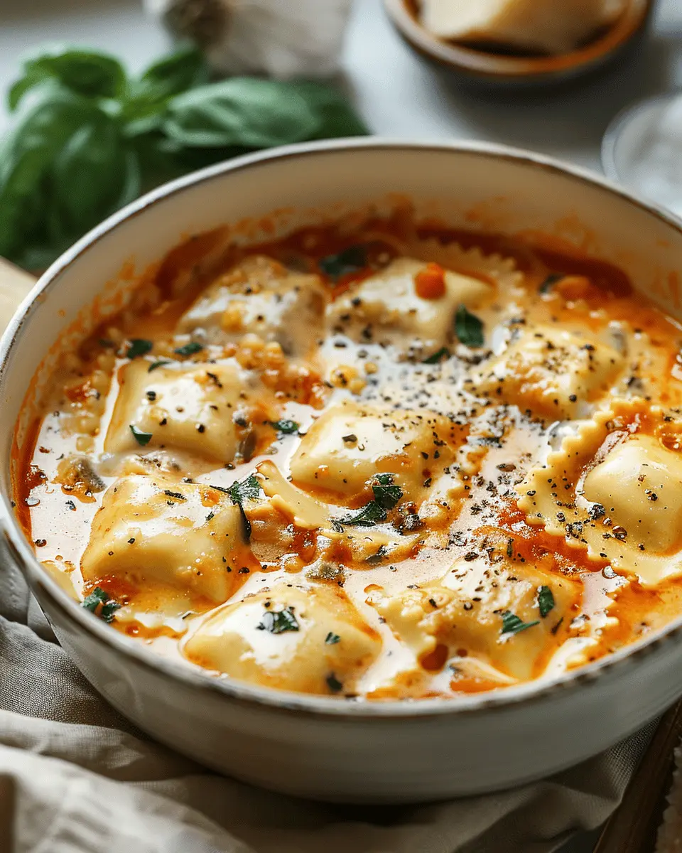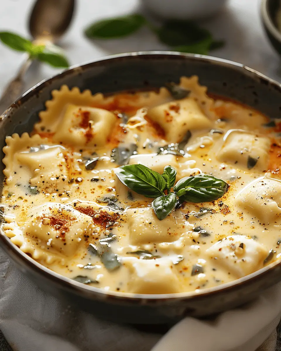 A delightful creamy soup featuring ravioli, perfect for a comforting meal.
