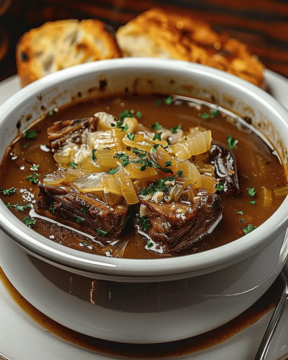 A rich and flavorful soup that combines the savory goodness of French onion soup with tender beef short ribs, making it the perfect dish for cold weather.
