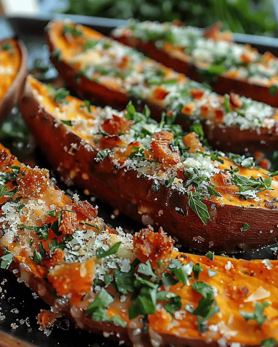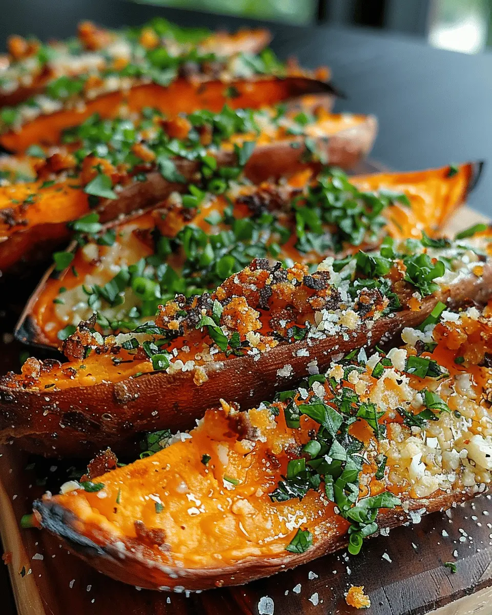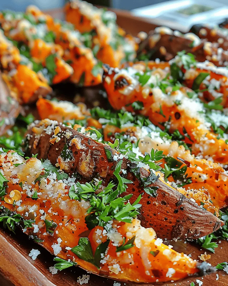 A delicious and healthy snack that combines the flavors of garlic and parmesan with sweet potatoes.