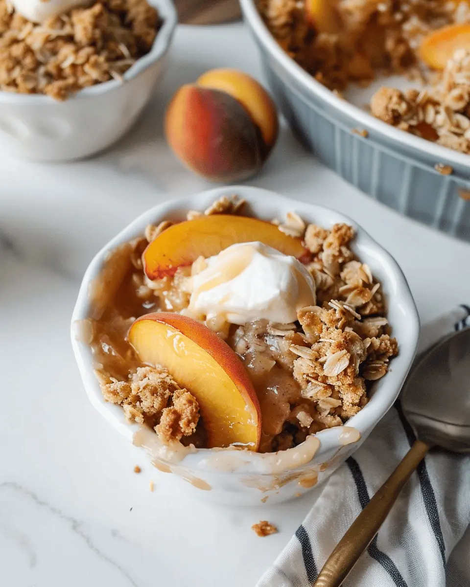 - Top It Off: Sprinkle the crunchy topping over the peaches, ensuring an even layer for maximum crispiness.