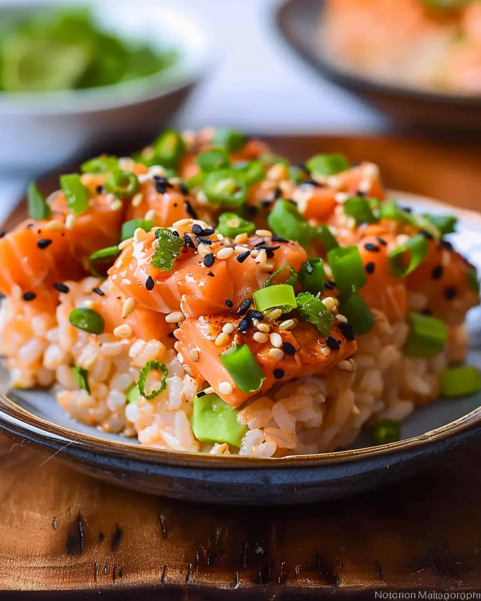 This dish also lends itself beautifully to creativity. Want to spice it up? Add some avocado slices or pickled veggies for an extra layer of flavor. Or perhaps, drizzle some wasabi mayo for that extra kick! The textural contrast of crispy rice paired with tender salmon and crunchy toppings makes each bite a mini experience.