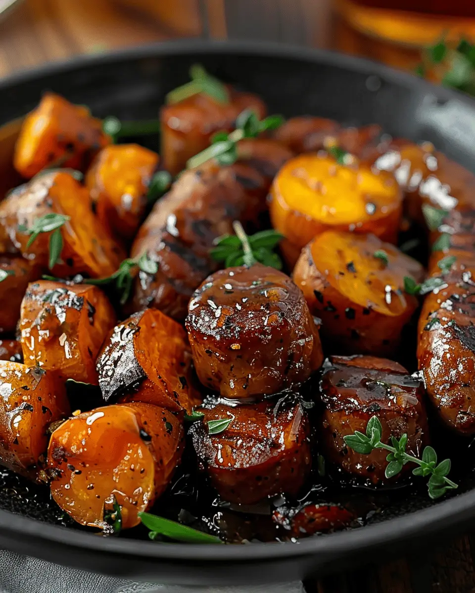 PrintSausage and Sweet Potatoes: Easy Dish with Honey Garlic Sauce