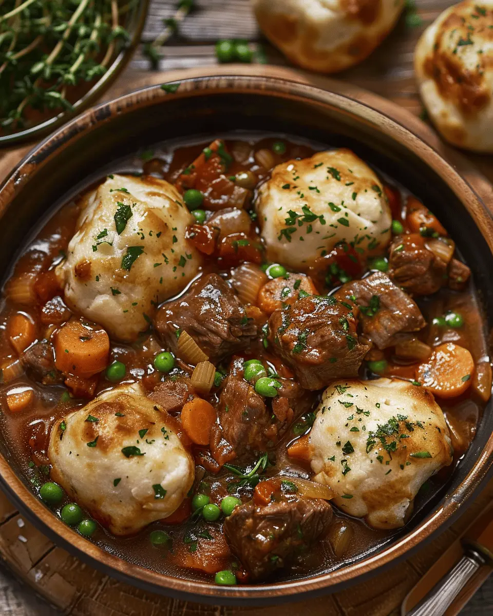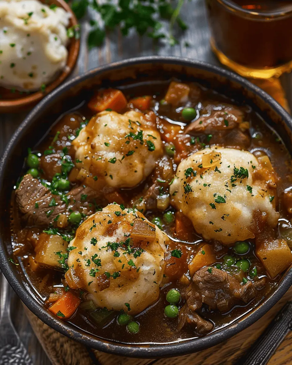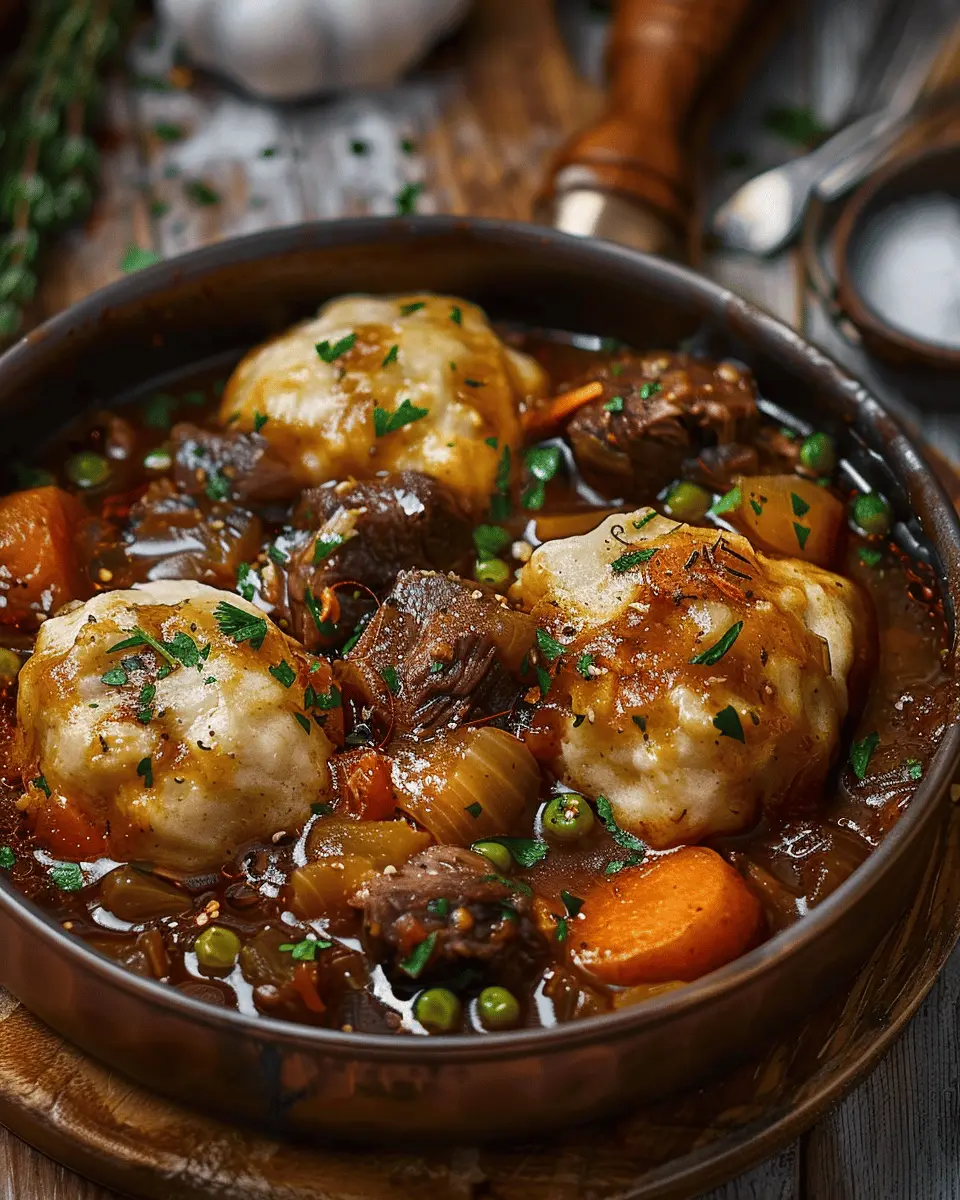 A hearty and flavorful beef stew served with tender dumplings, perfect for a comforting meal.