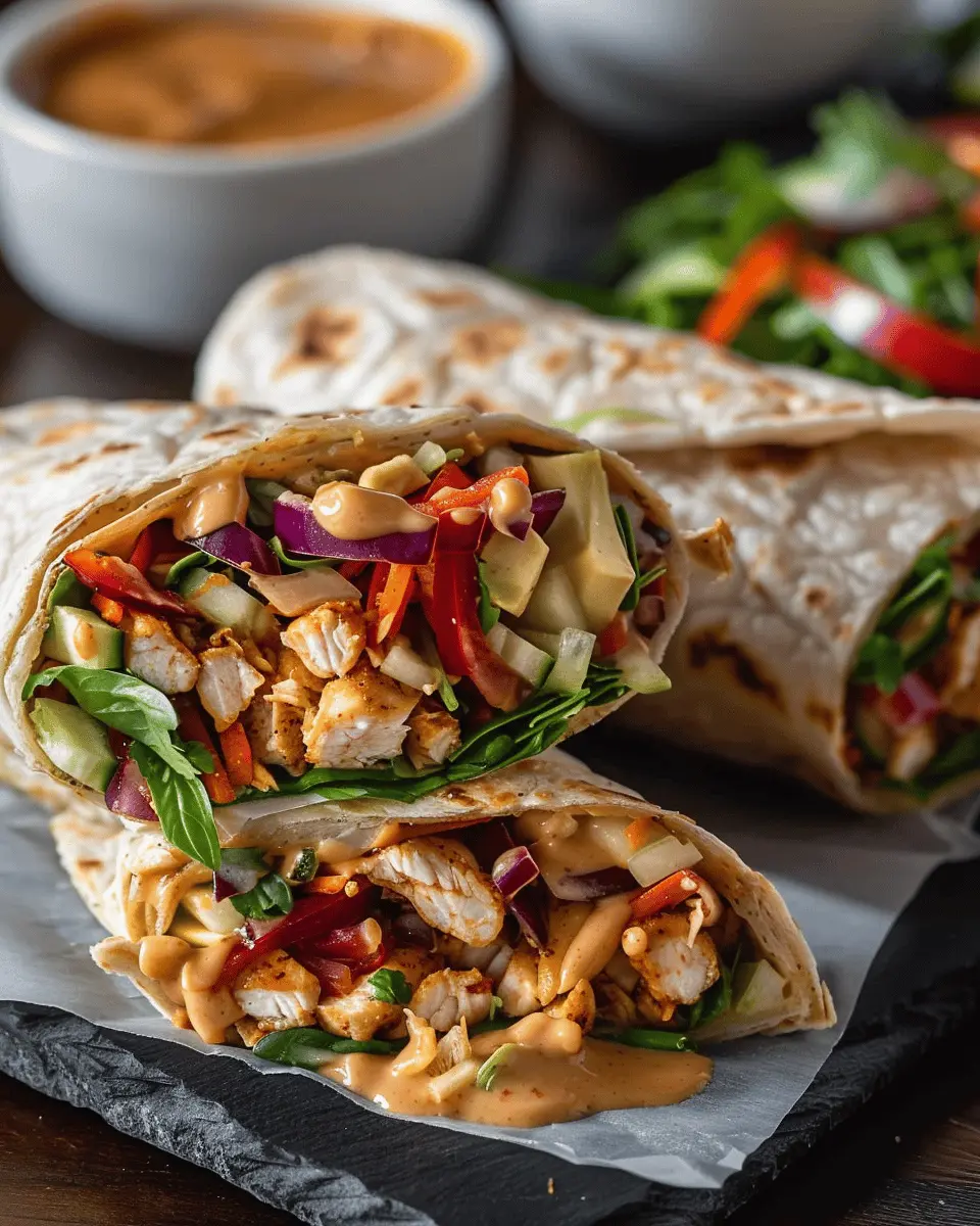 Quick and Easy Preparation: With minimal cooking time and simple ingredients, these wraps can be whipped up in no time. Only need a few essentials like grilled chicken, lettuce, bell peppers, and peanut sauce, which you can easily prepare in advance or purchase ready-made.